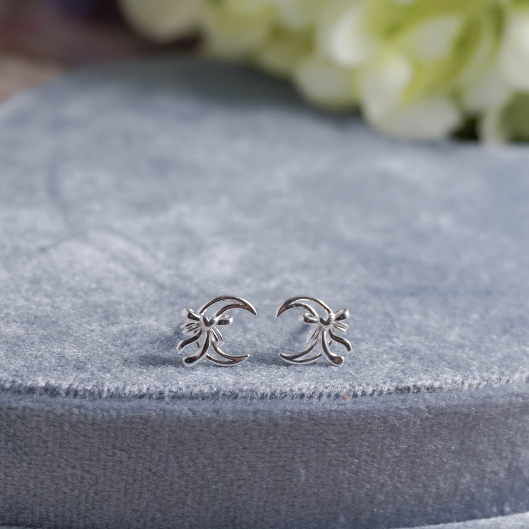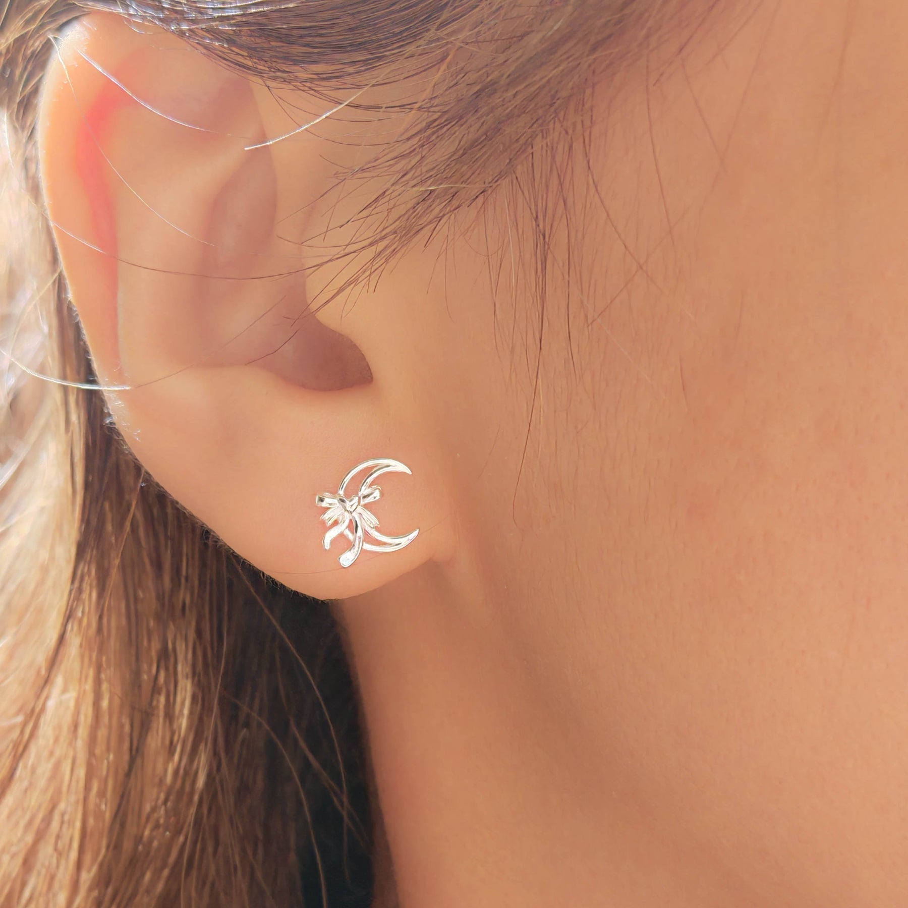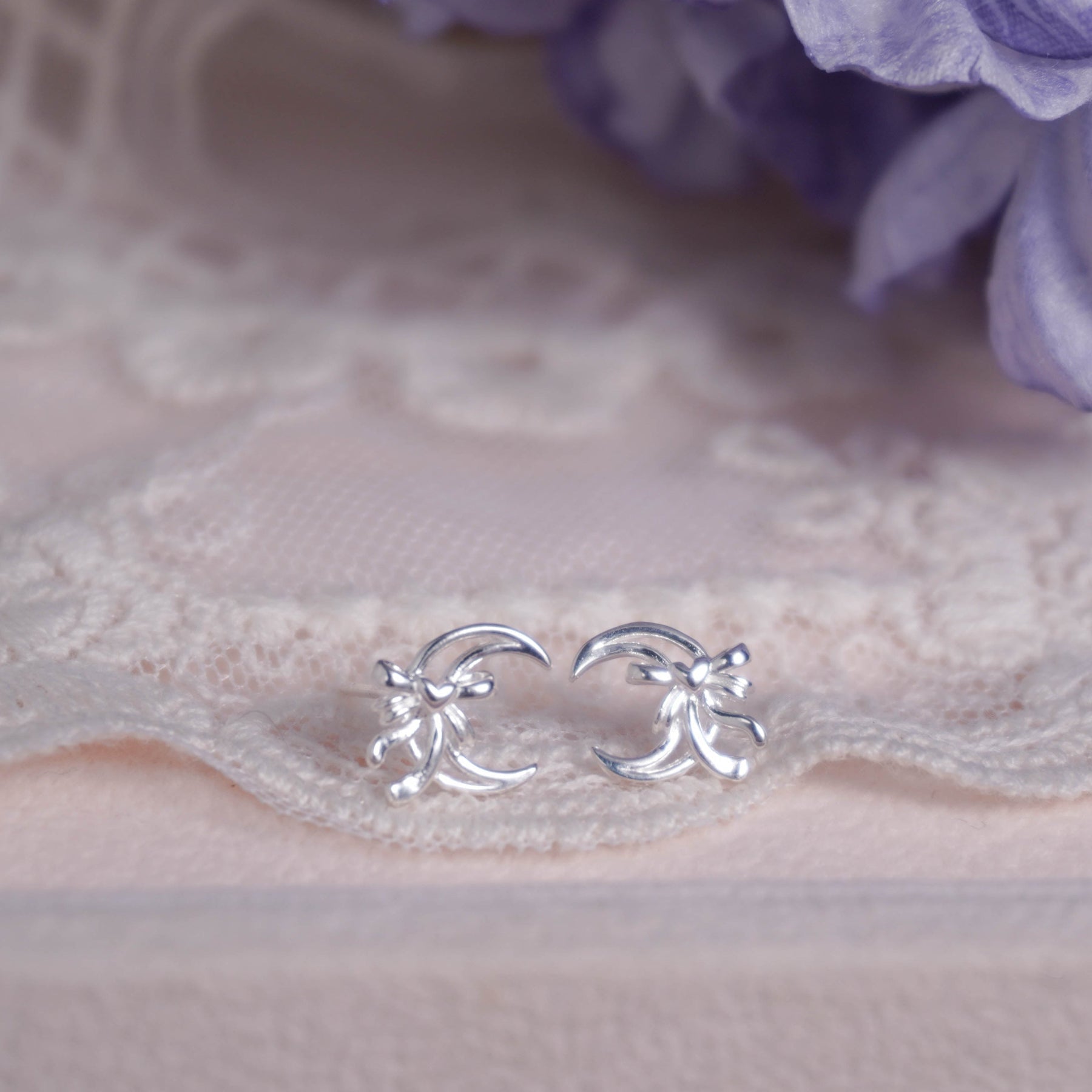 Embrace a touch of celestial elegance with our Moonlit Bow Stud Earrings, delicately crafted in 999 sterling silver. Featuring a graceful crescent moon adorned with a petite ribbon, these dainty silver earrings capture the perfect balance of sweetness and sophistication.