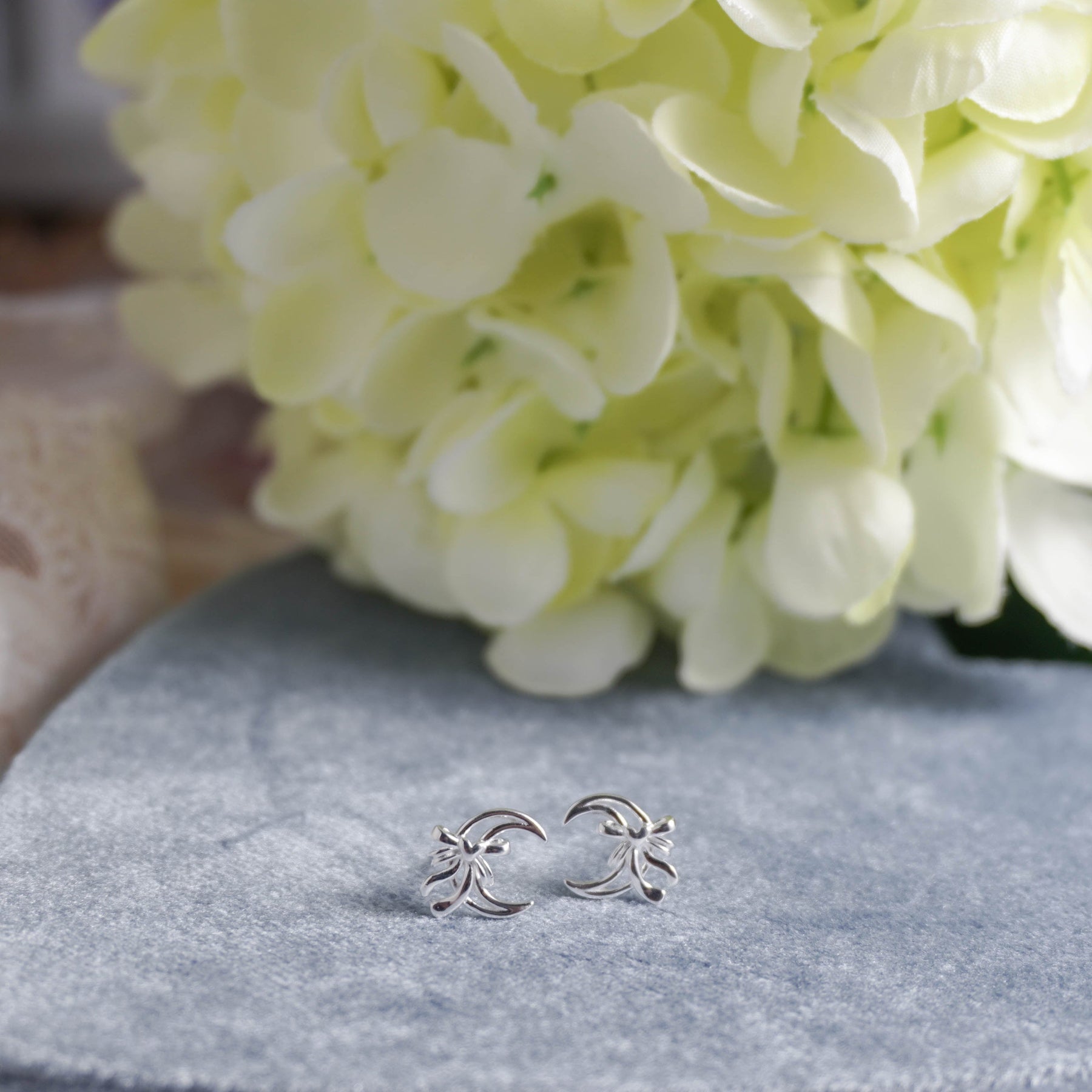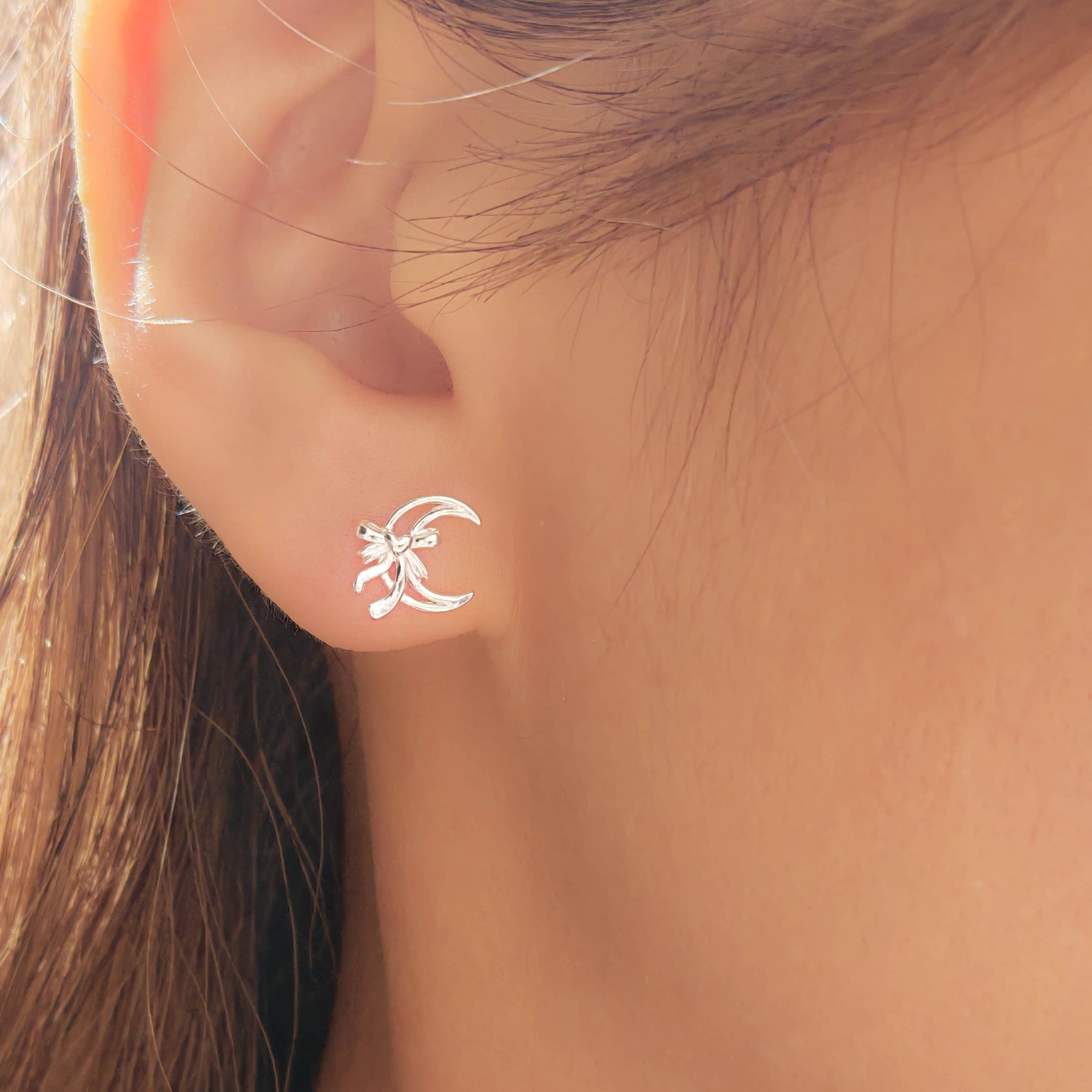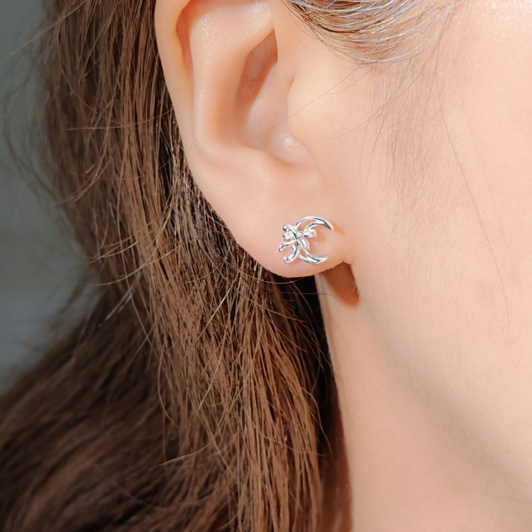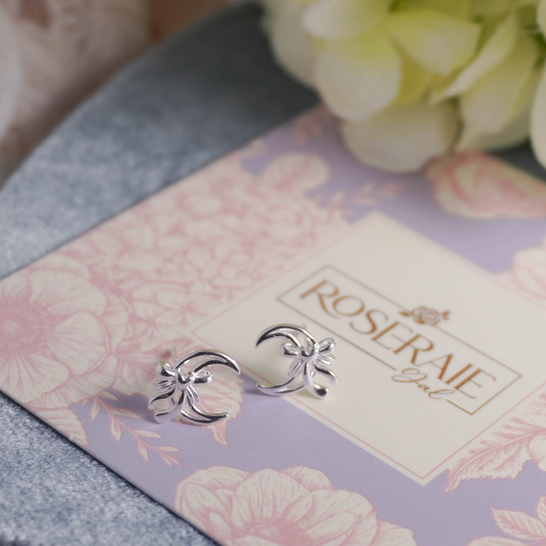 Embrace a touch of celestial elegance with our Moonlit Bow Stud Earrings, delicately crafted in 999 sterling silver. Featuring a graceful crescent moon adorned with a petite ribbon, these dainty silver earrings capture the perfect balance of sweetness and sophistication.