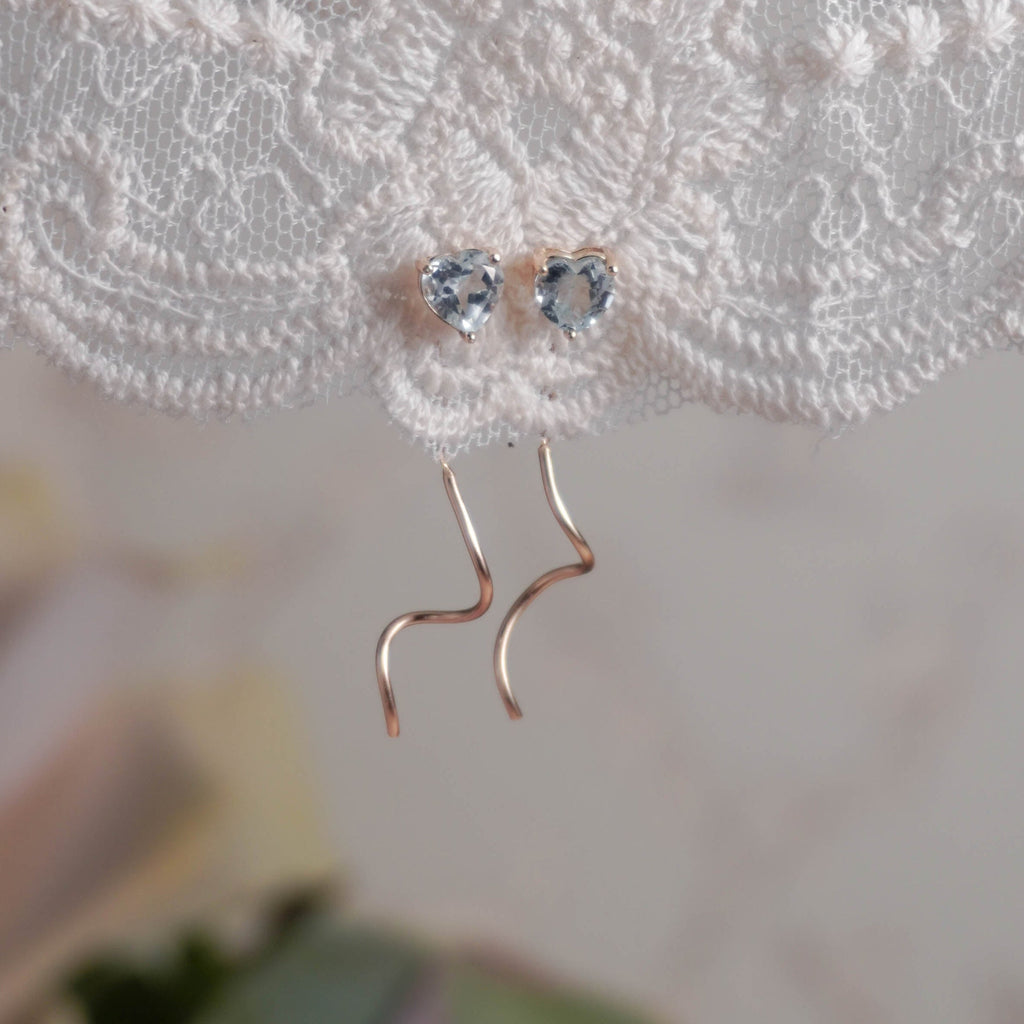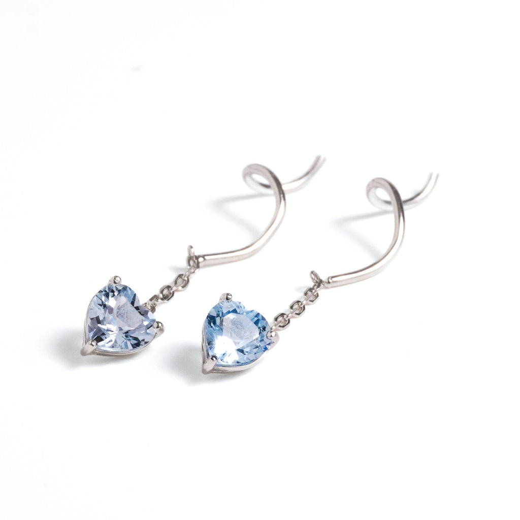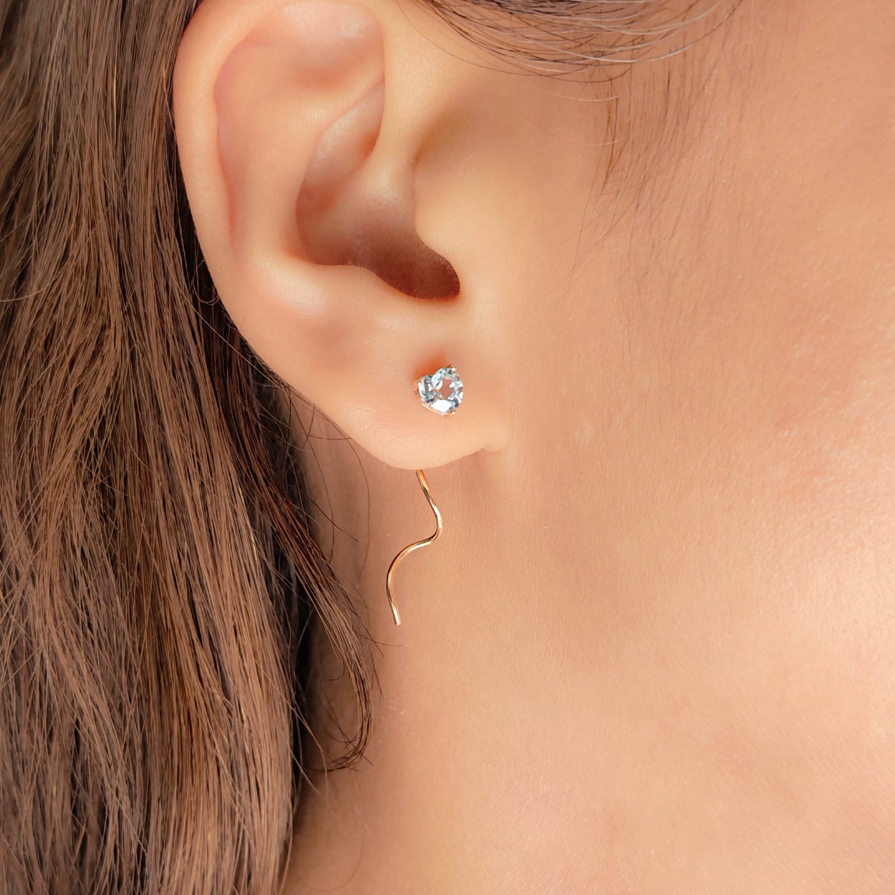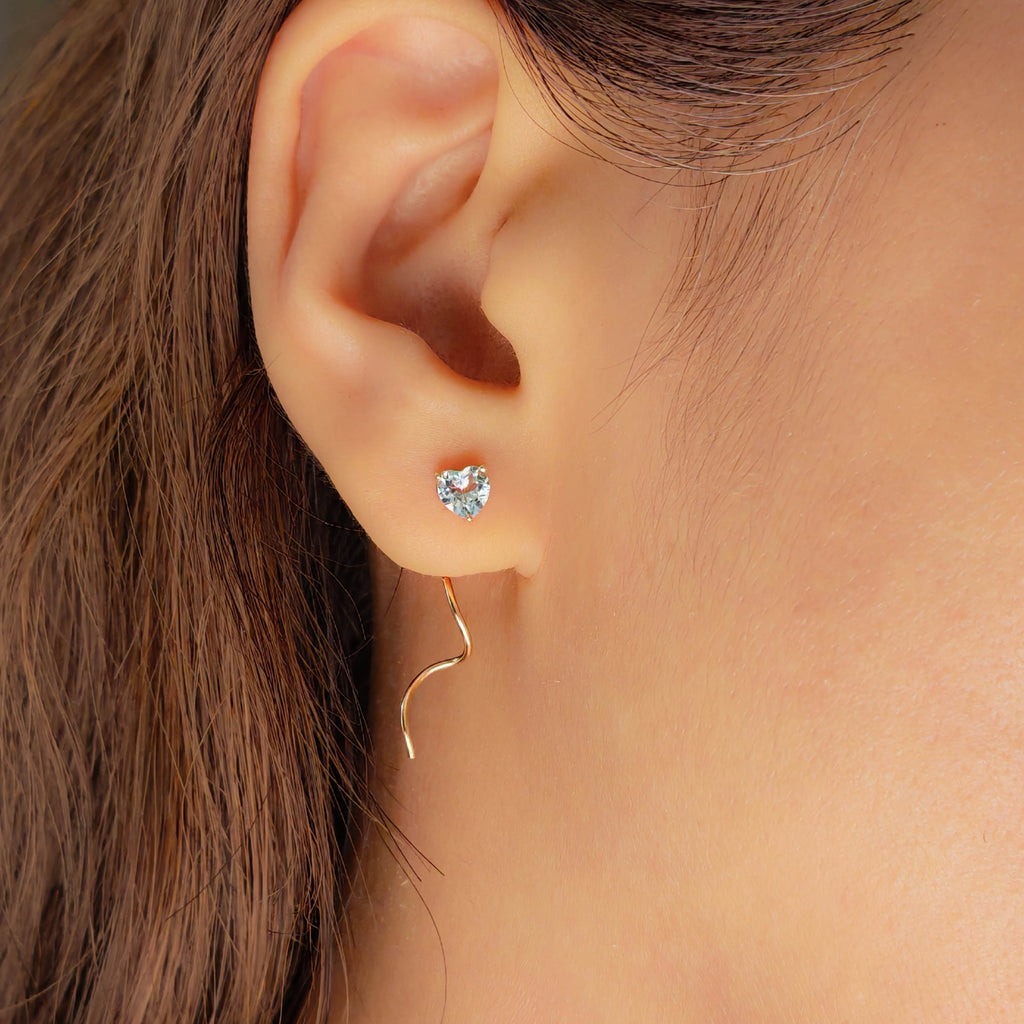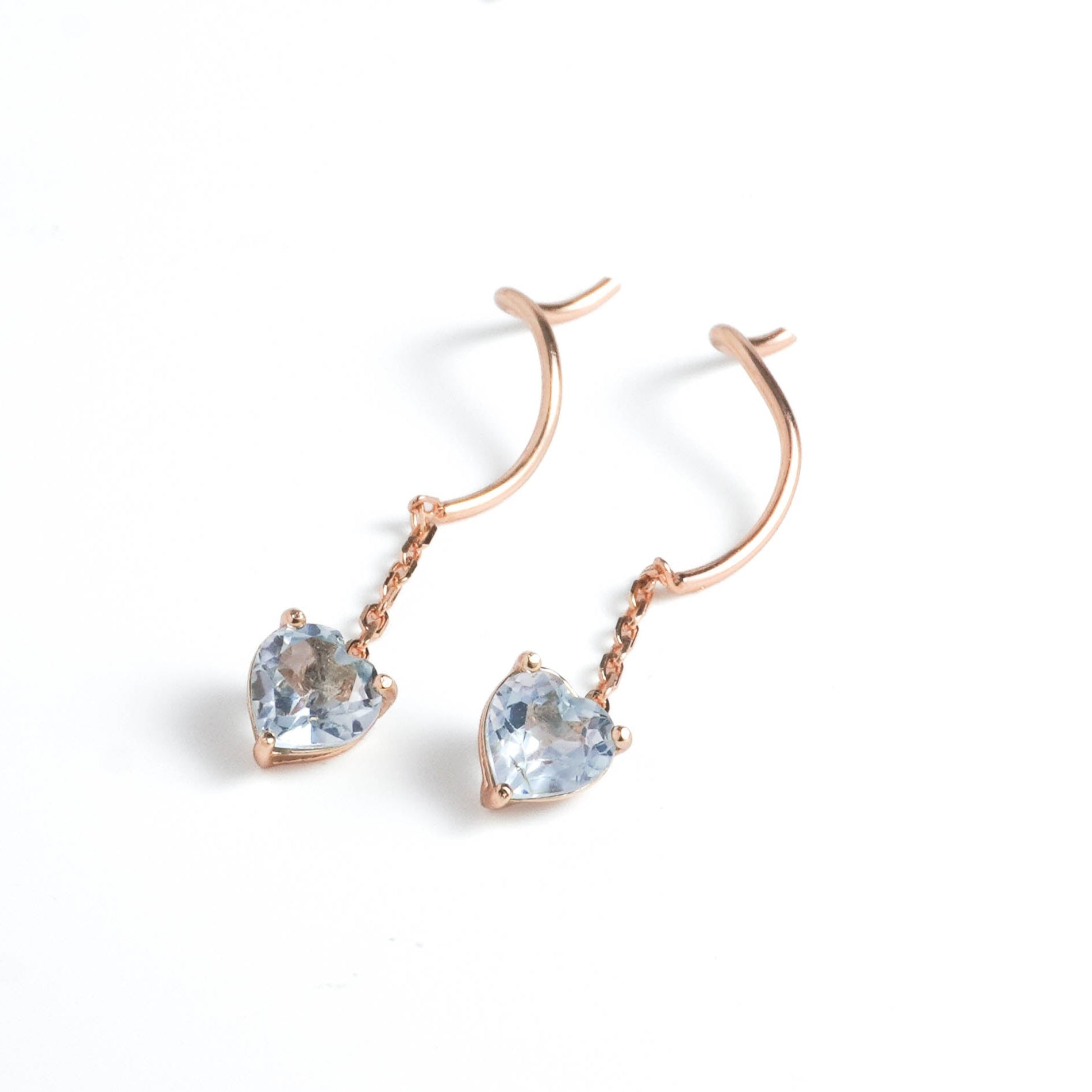 Bright and refreshing, sky blue topaz hearts dangle effortlessly from sterling silver threaders. Choose champagne gold or rhodium plating for a look that suits your style. Blue topaz is often linked with clear communication and positive energy — a stone said to inspire calmness and honest expression. A simple design with a fresh, uplifting mood. Sold as pair.