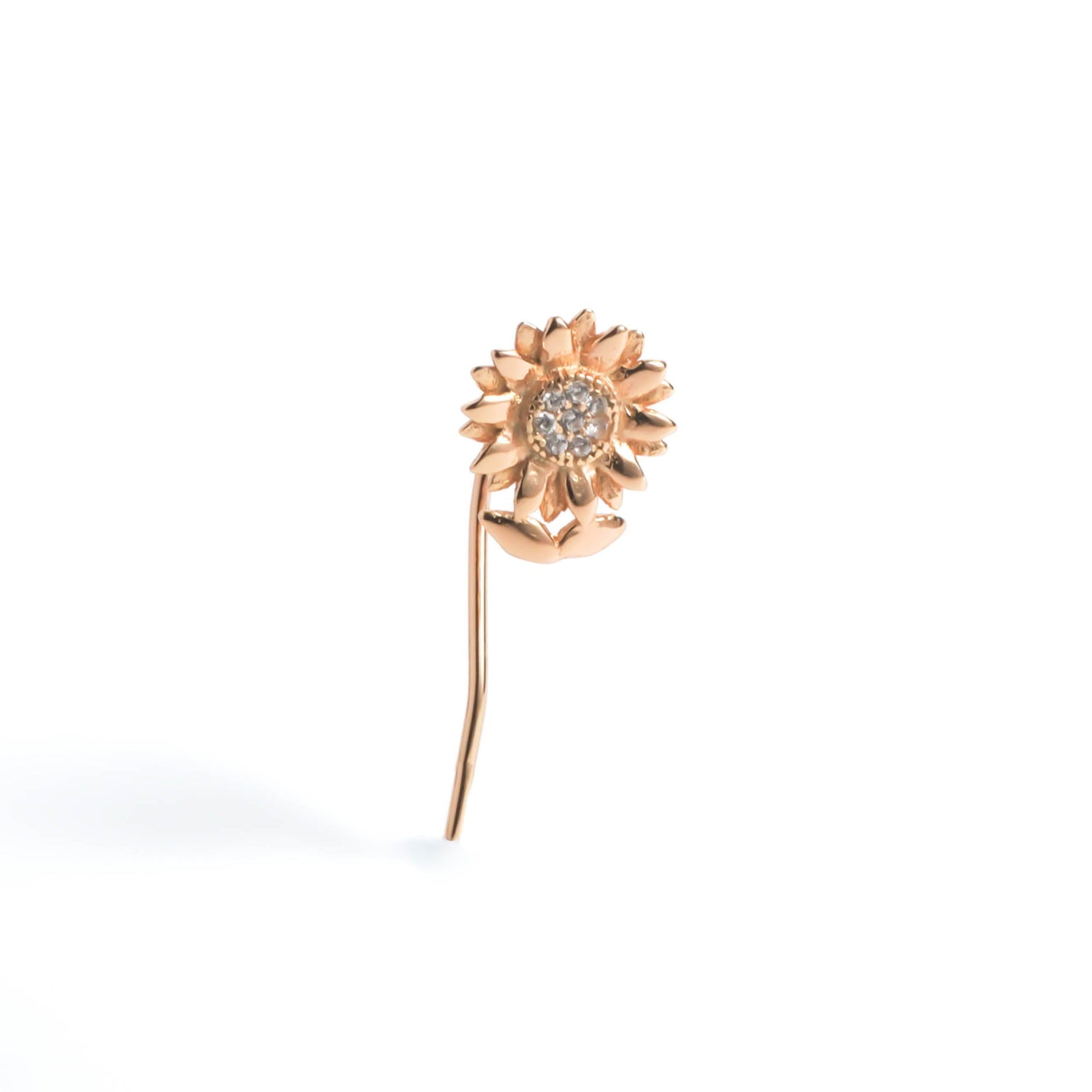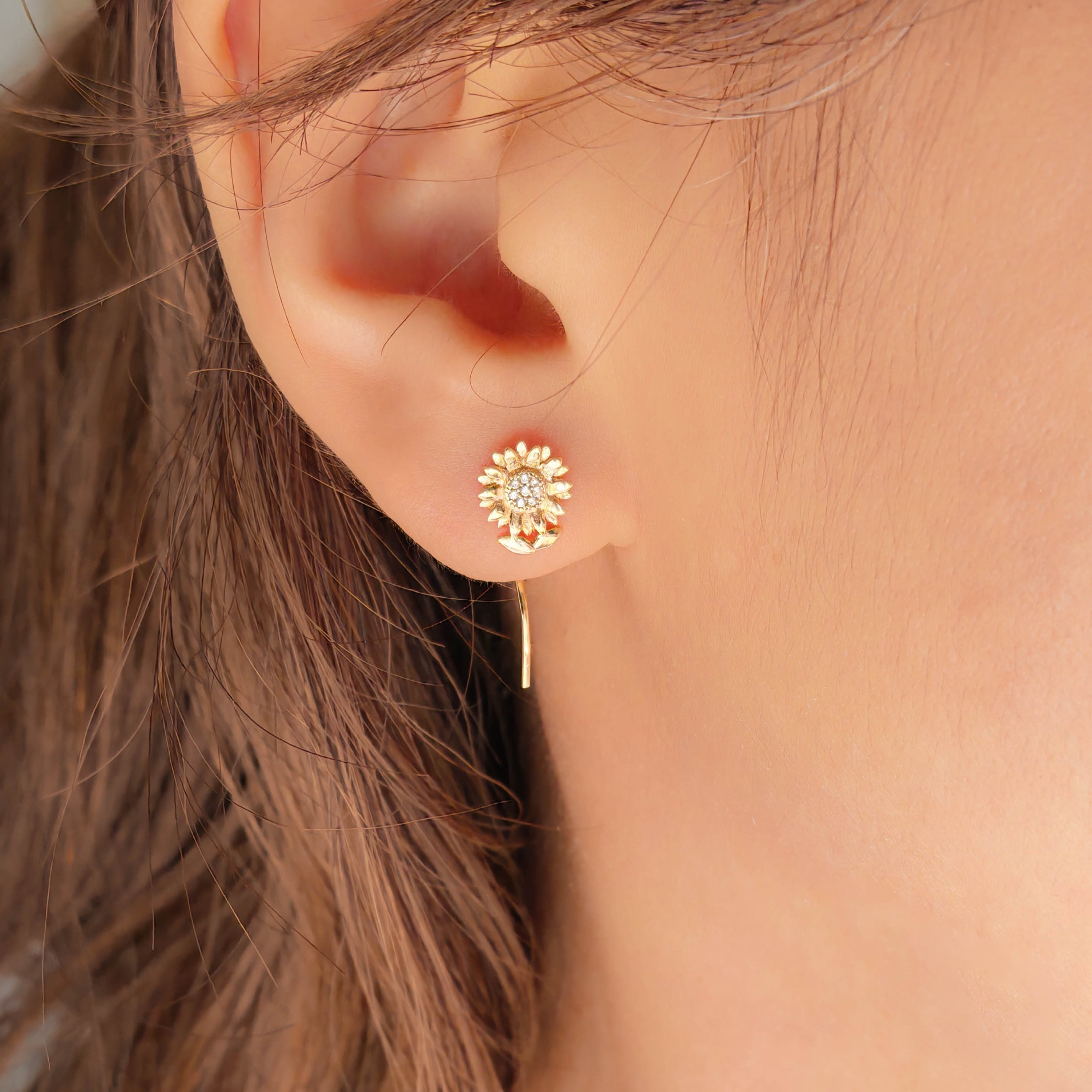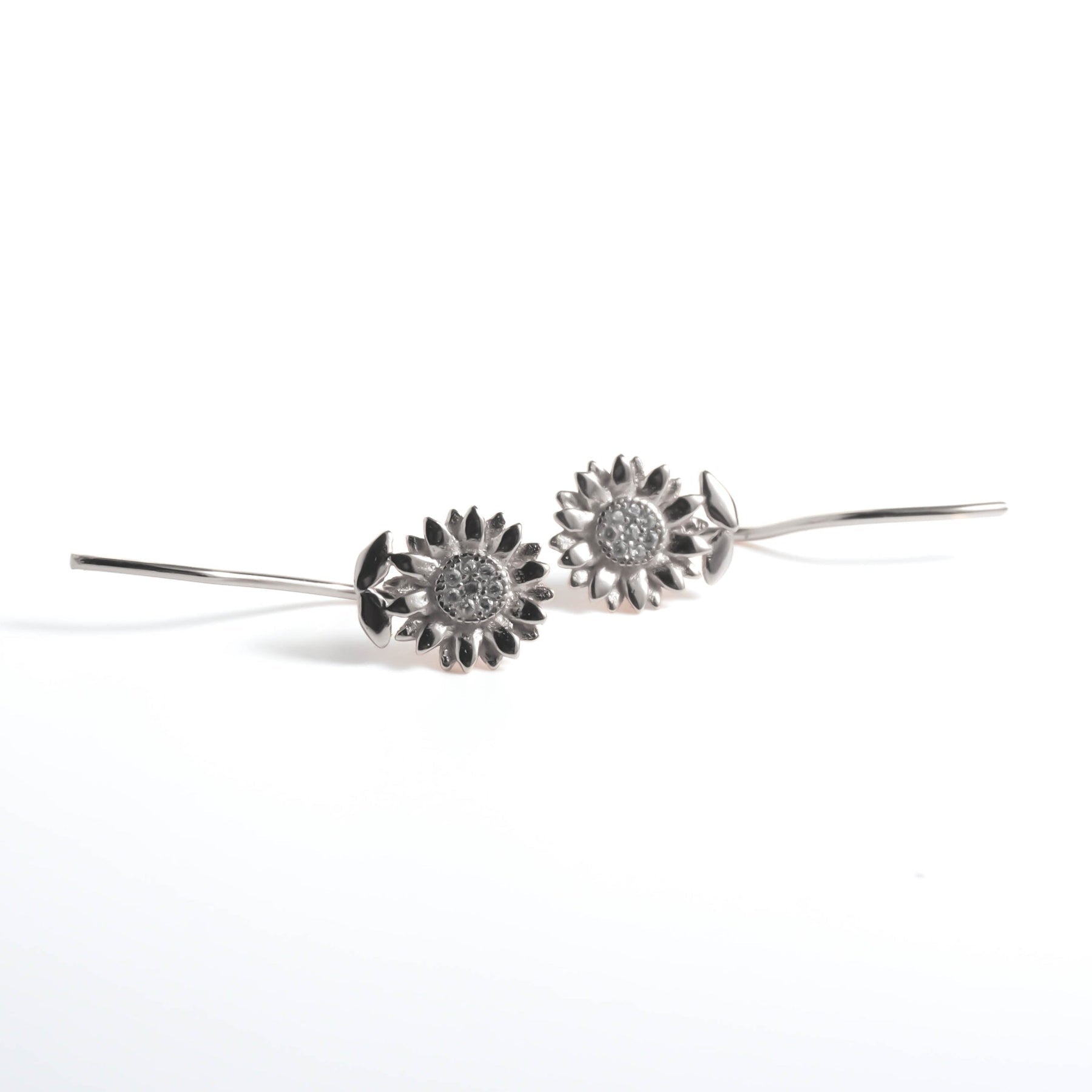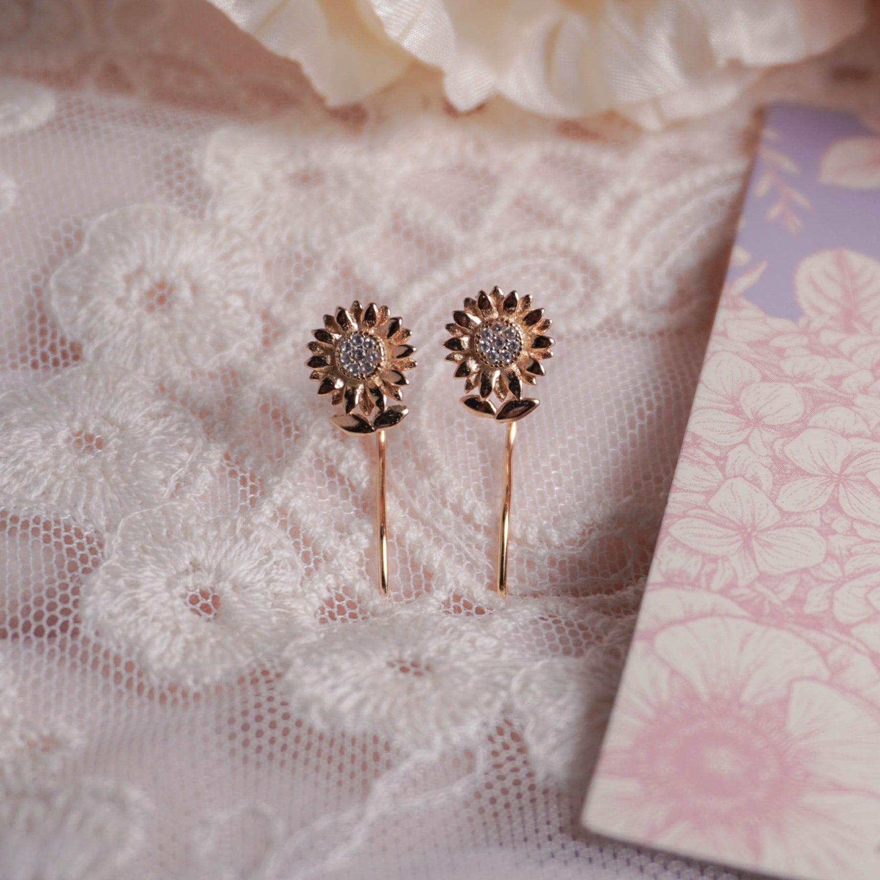 A sunflower in full bloom, complete with its graceful stem. These earrings capture the charm of nature in a dainty design that feels fresh and elegant. Worn along the ear, the sunflower and stem create a delicate silhouette that makes a quiet statement — feminine, timeless, and full of warmth. Perfect for anyone who wants jewelry that carries the beauty of a flower garden into everyday life. Sold as pair.