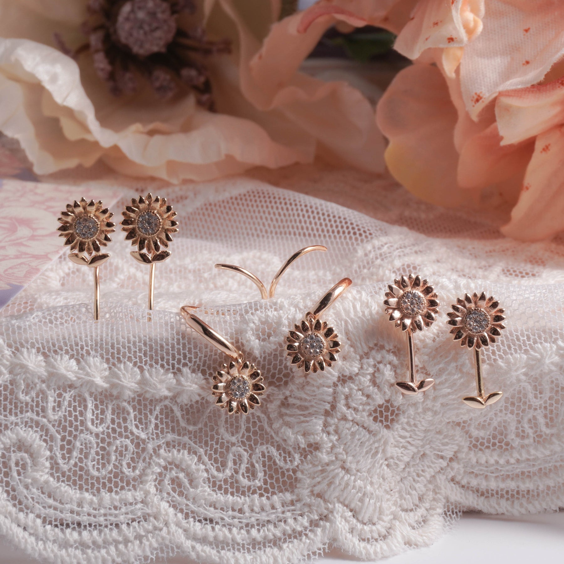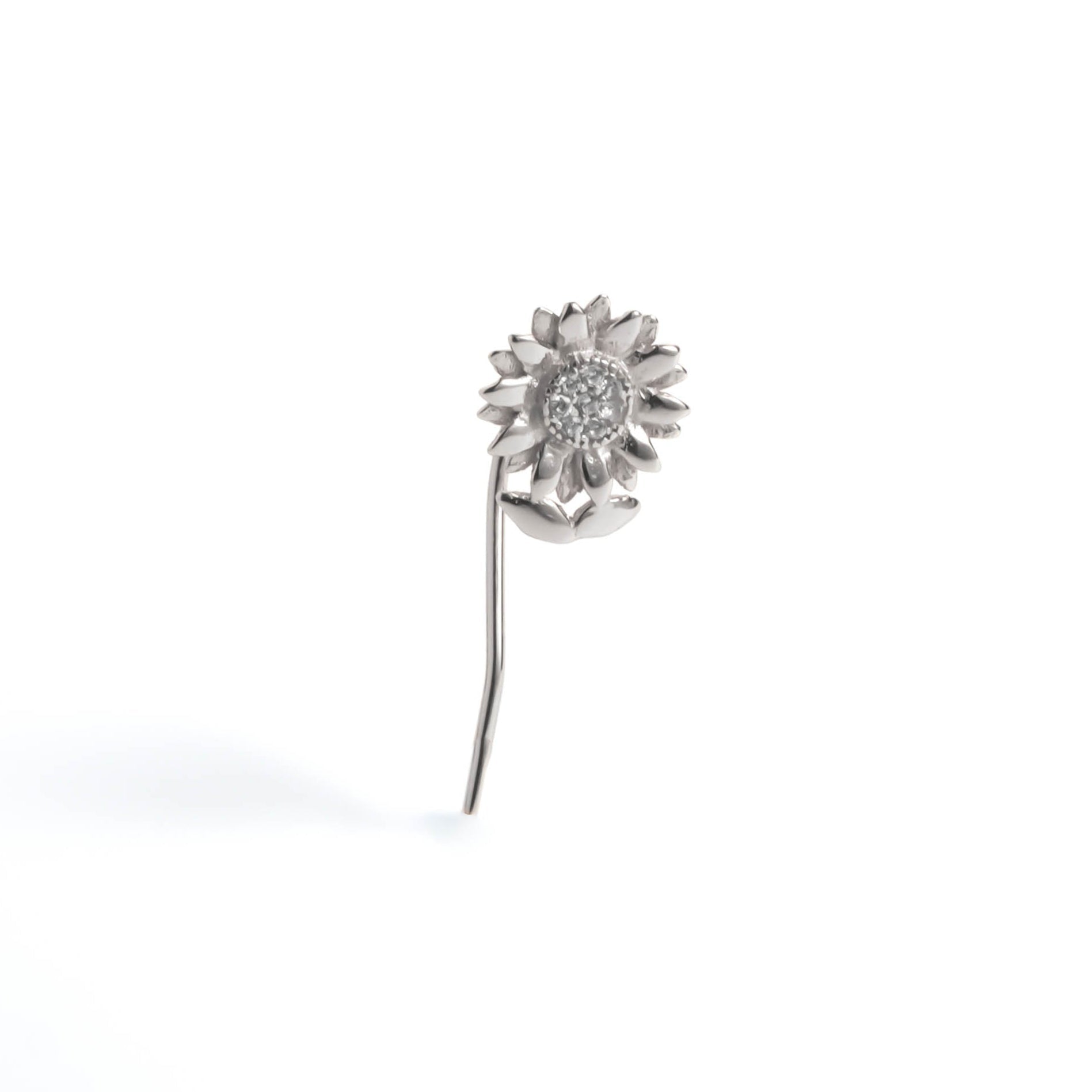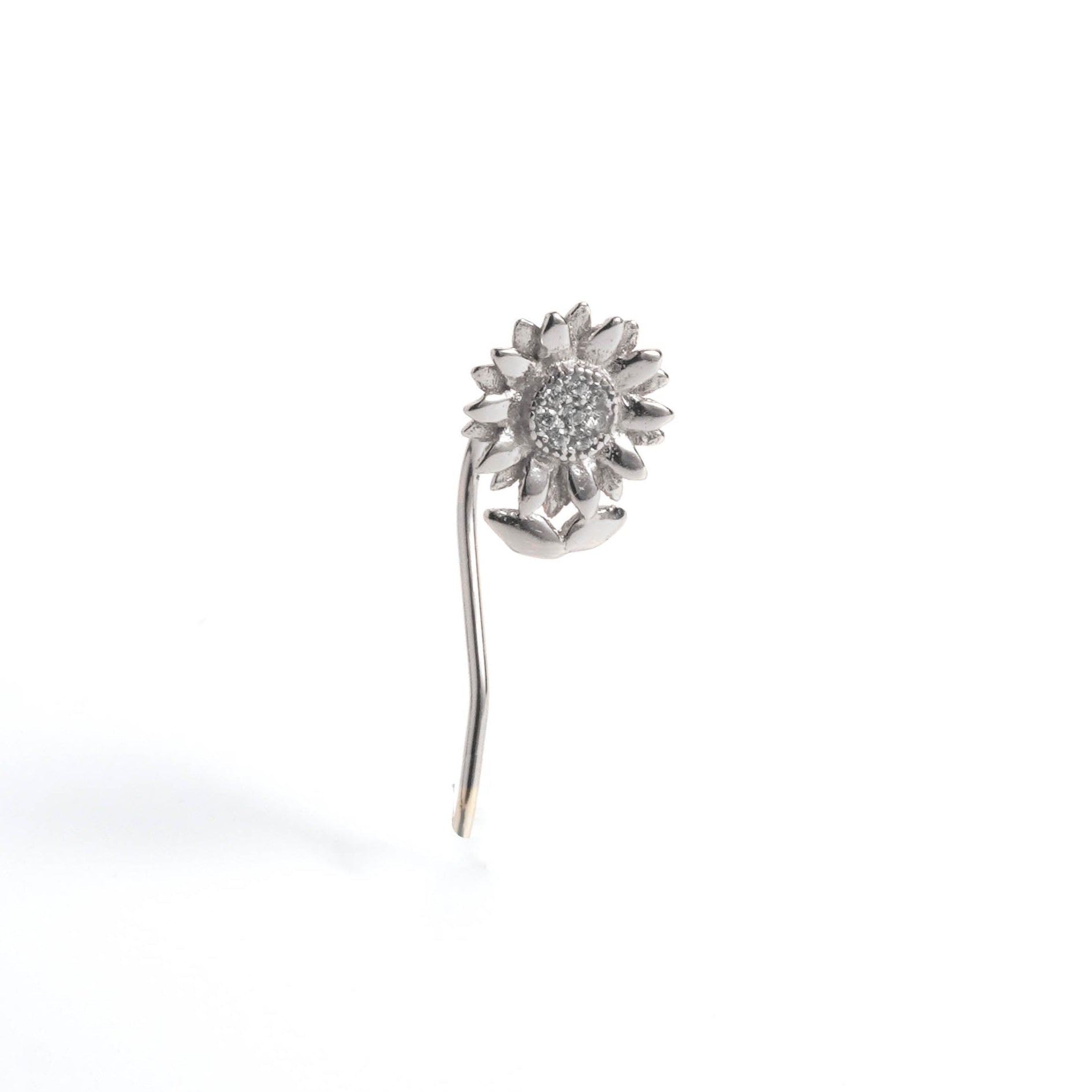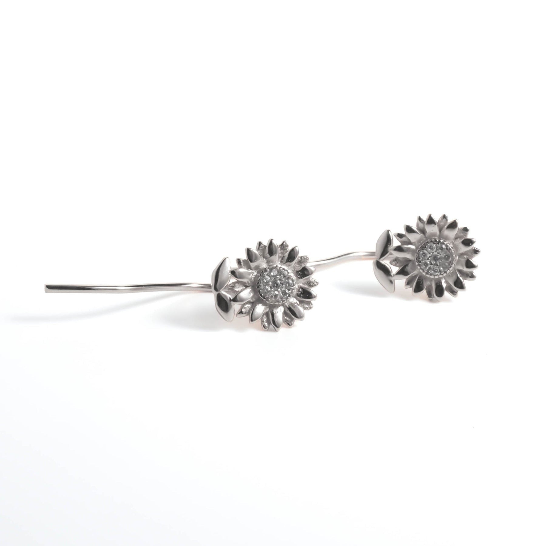 A sunflower in full bloom, complete with its graceful stem. These earrings capture the charm of nature in a dainty design that feels fresh and elegant. Worn along the ear, the sunflower and stem create a delicate silhouette that makes a quiet statement — feminine, timeless, and full of warmth. Perfect for anyone who wants jewelry that carries the beauty of a flower garden into everyday life. Sold as pair.