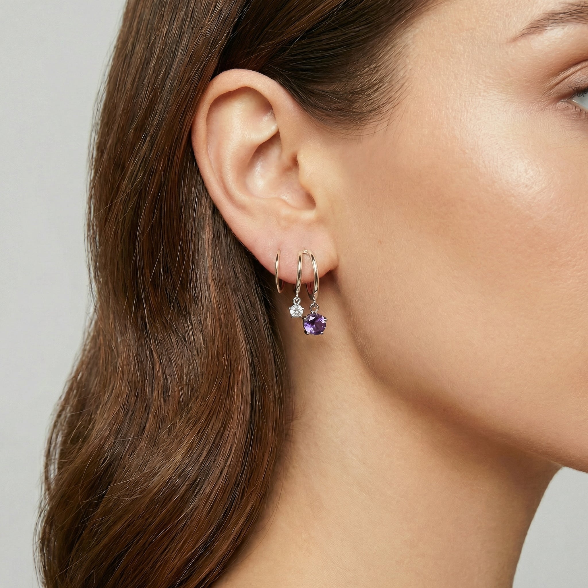 Rich purple amethyst combined with brilliant cubic zirconia creates a romantic yet modern contrast. Designed for a double piercing illusion, these sterling silver hoop earrings give you a chic layered ear look effortlessly. Elegant, versatile, and easy to style daily.Sold as pair.