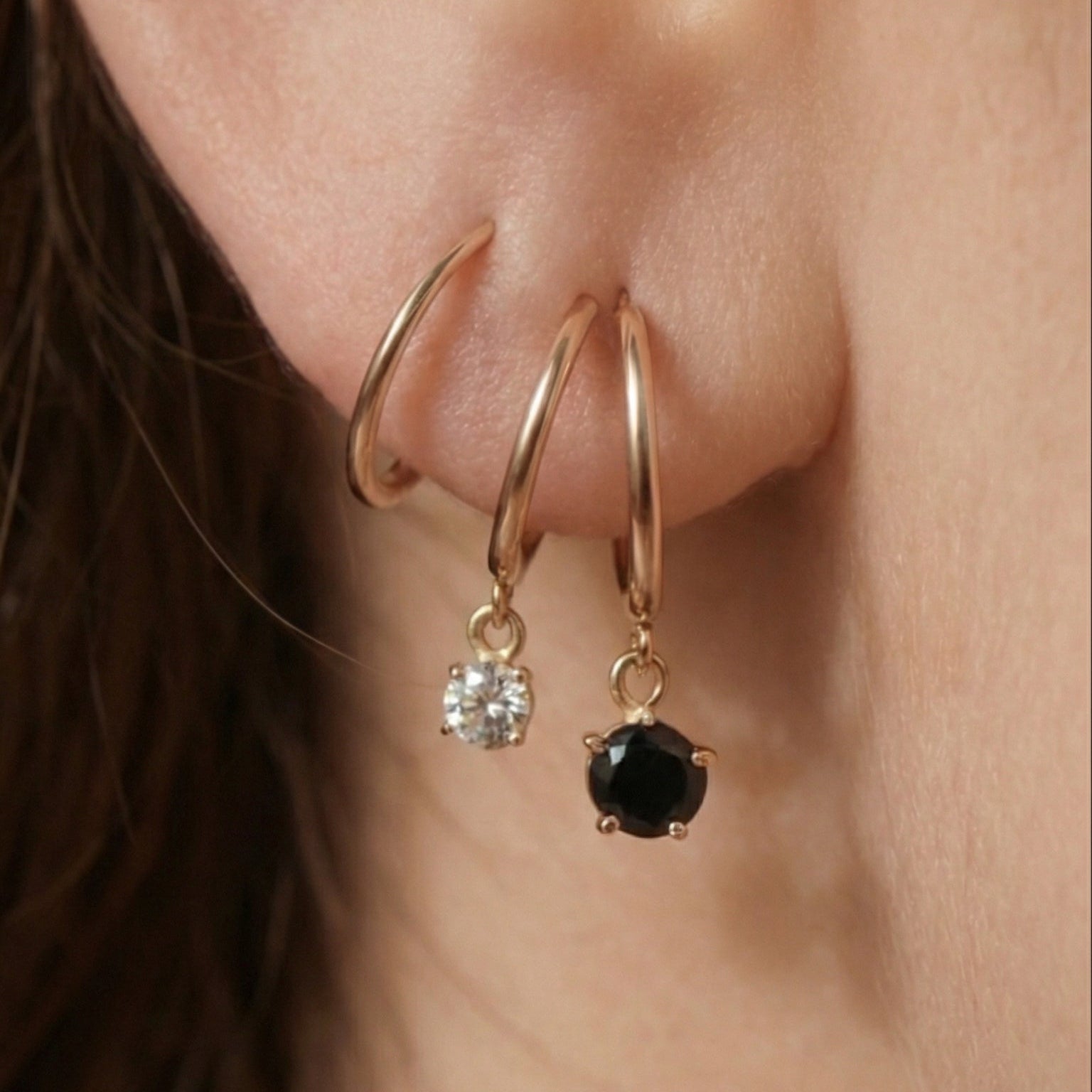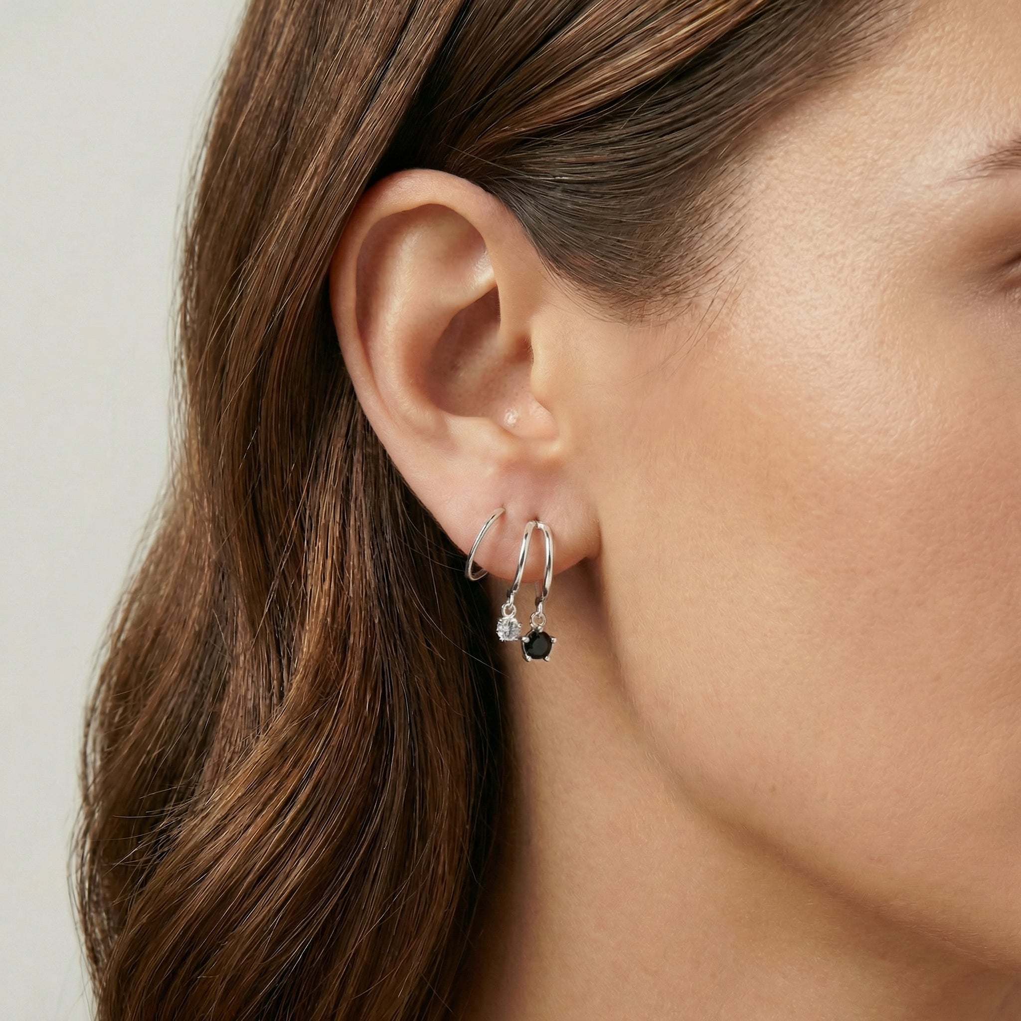 Bold black onyx paired with sparkling cubic zirconia creates a striking yet minimalist statement. Crafted in 925 sterling silver, these two-in-one hoop earrings give the illusion of double piercings with just one hole. Perfect for edgy everyday styling or evening wear. Sold as pair.