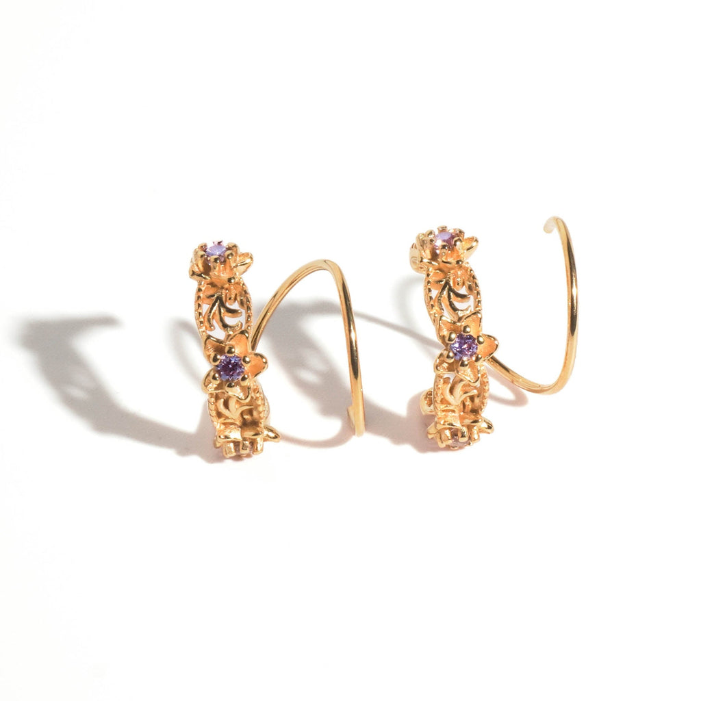 The standout floral motif is richly detailed with vintage-inspired openwork, each petal kissed with delicate sparkle. Choose from two radiant finishes: a soft champagne gold plated or a cool-toned rhodium plated option adorned with lavender cubic zirconia gems.