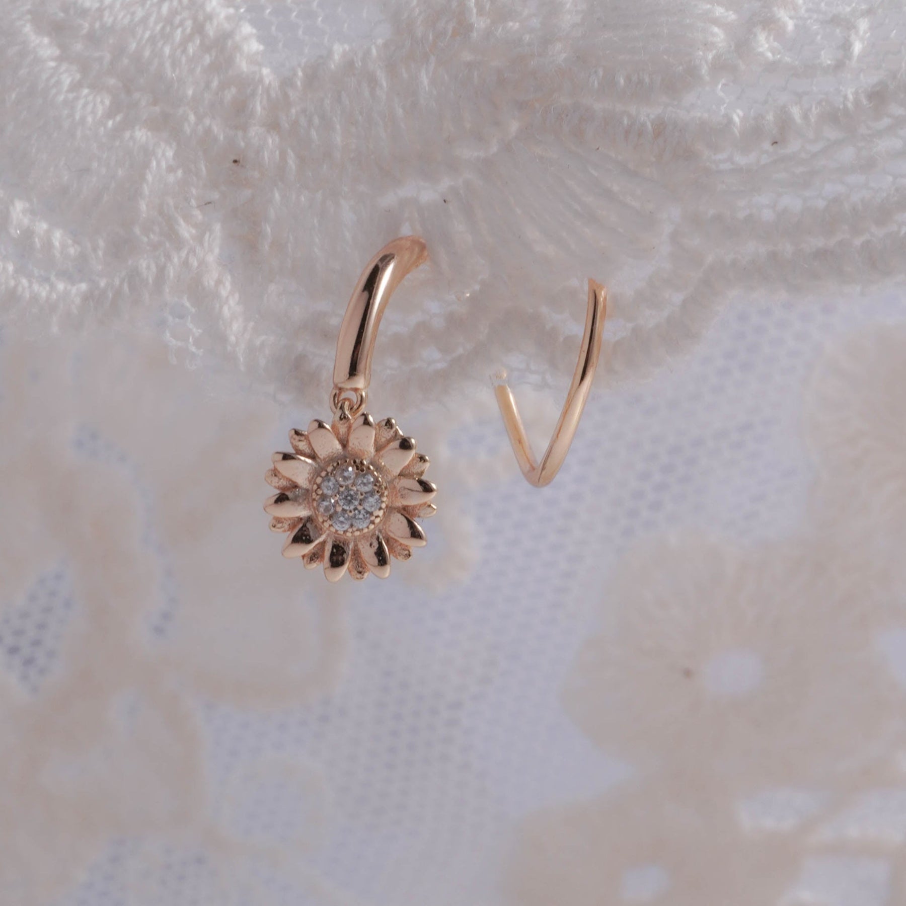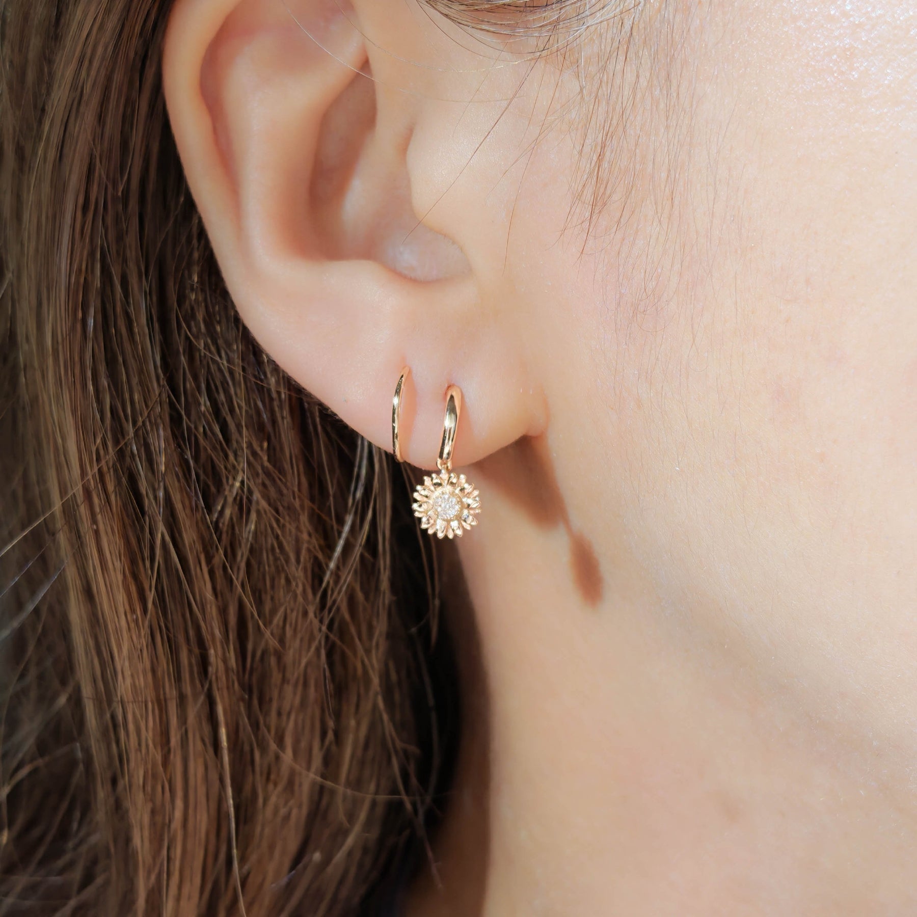 Carry a little sunshine with you wherever you go. These Sunflower Spiral Hoop Twist Earrings are part of our signature 1 piercing into 2 collection, designed to give you the look of a layered style with just one piercing. The dainty sunflower dangles catch the light as you move, adding a touch of warmth and effortless charm to your everyday look. Perfect for anyone who loves jewelry that feels both playful and elegant, they’re a reminder that even the smallest details can brighten your day. Sold as pair.