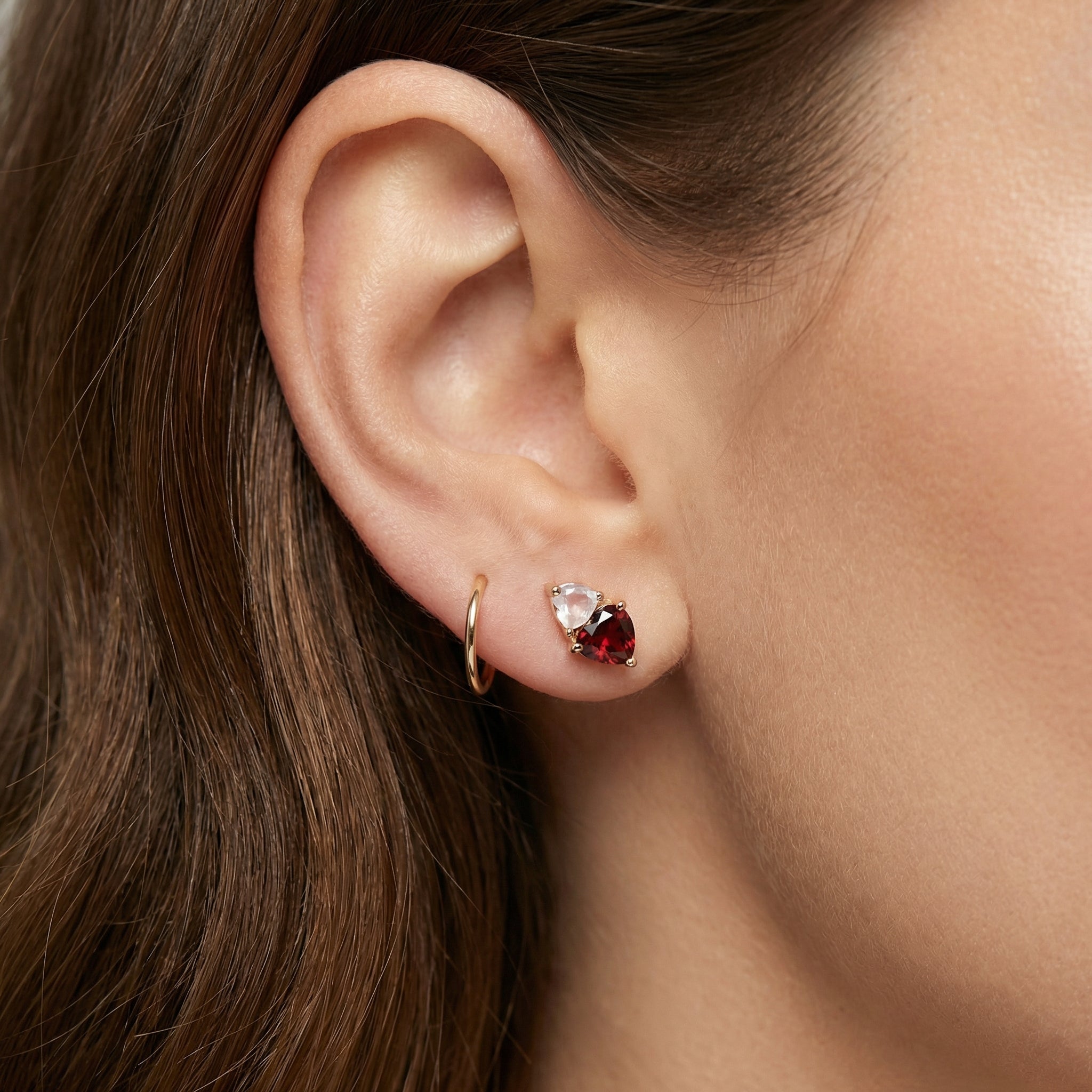 Deep red garnet paired with soft rose quartz creates a beautifully balanced romantic look. These sterling silver heart stud earrings feature a unique two-in-one design that gives the illusion of double piercings. Elegant yet affordable, perfect for date nights or everyday feminine styling.Sold as pair.